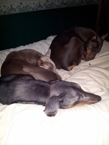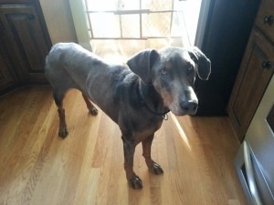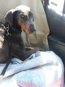 Hi Fallon, just want to send you an update on Jake-Bruno’s adoption. He’s been with us a week and is doing great. The good foundation his fosters Tamara and Dave afforded makes his adjustment here easier. We think he is a gem of a dog… calm, loving, very tolerant of cats and just an all around good boy! He had his “trial by fire” today when the 2 and 4 year old grandkids visited… after 10 minutes of the screamin’ meemies I was ready to head for the hills… but Jake took it all in stride, we were so proud of him. My vets laughed when they saw this severe textbook case of CDA. One remarked, “well, if anyone would adopt a (bald) Dobe it’s Miss Barbara!” But they sure were impressed with his laid back nature! We think he’s beautiful! Keep up the good work, we appreciate it…